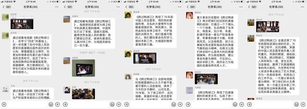 教师孟媛媛:通过观看电视剧跨过鸭绿江,我们深刻的体会到现在幸福生活的来之不易,体会到党的伟大历程和党决策的高瞻远瞩。作为一名基层教师,我们要紧跟党的步伐,贯彻党的政策,响应党的号召,珍惜现在,努力工作,刻苦钻研,为教育事业贡献自己的力量。