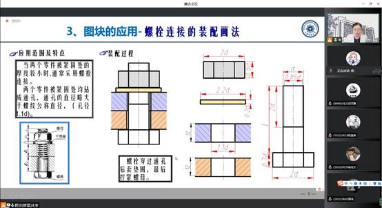 公开课上,修妍以《机械图学B(2)》课程中CAD绘图软件的“创建图块”、“插入图块”命令等,讲解并演示了螺栓装配图的绘制方法。