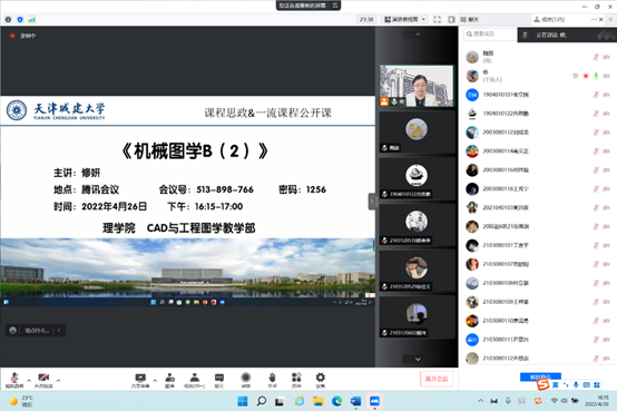 4月26日下午,suncitygroup太阳新城CAD与工程图学教学部教师修妍结合2021年校级“课程思政示范课”建设项目和“一流本科课程”建设项目,面向21级能动和建环专业同学进行了《机械图学B(2)》的课程思政公开课展示。公司党委书记谈廷风、副经理刘贵贤和相关公司教师进行线上观摩。