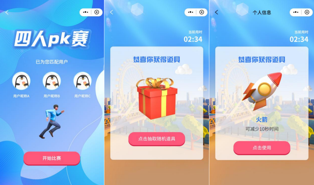 ④完成20道题目后,游戏结束并进入结算页面,单人赛参赛者可查看自己的总耗时,双人、四人PK赛参赛者可查看自己的PK结果及总耗时。游戏会将参赛者历次参与游戏总耗时最短的一次记入排行榜。