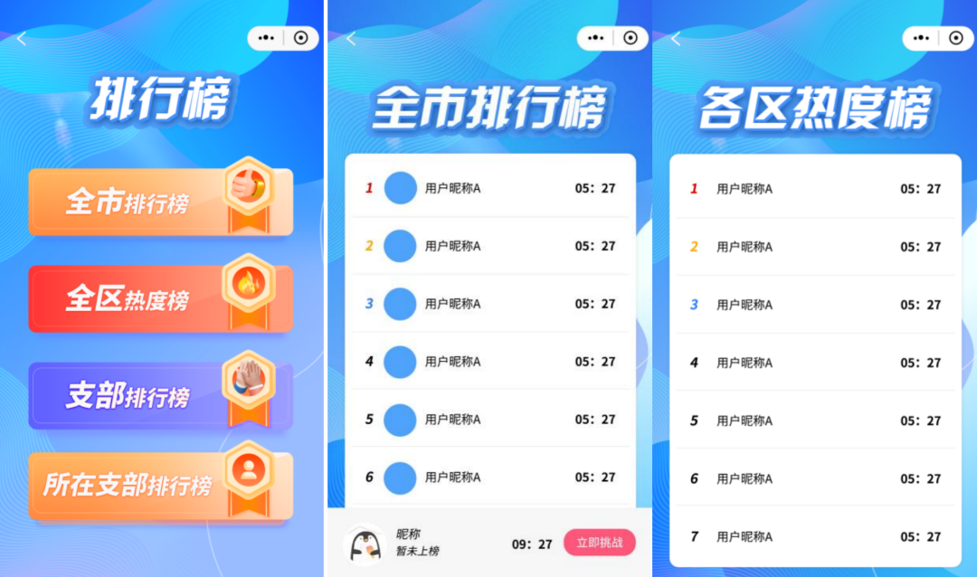 ⑤参赛者可在游戏主页查看排行榜,排行榜包括全市排行榜、各区热度榜、支部排行榜、所在支部排行榜。全市排行榜按照全市参赛者总耗时由少到多进行排名;各区热度榜显示各区参赛者的总数;支部排行榜按照各支部总耗时的平均值由少到多进行排名;所在支部排行榜按照该支部参赛者总耗时由少到多进行排名。