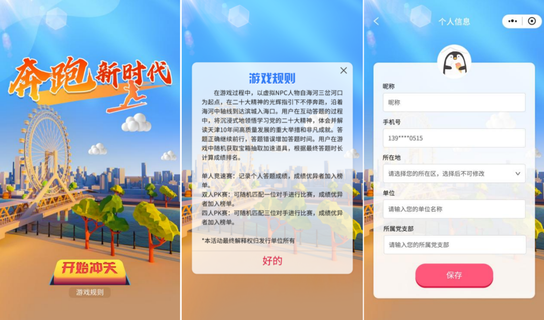 ②在页面内完善姓名、联系方式、所在区、单位、所属党支部(温馨提示:各支部名称请规范填写哦)等信息后参与游戏。游戏分为单人竞速赛、双人PK赛、四人PK赛三大类,其中双人、四人PK赛将随机为参赛者匹配对手进行比赛。