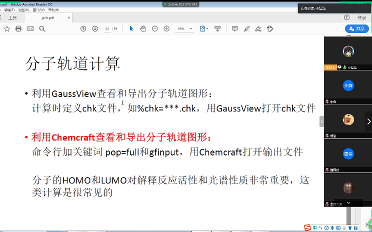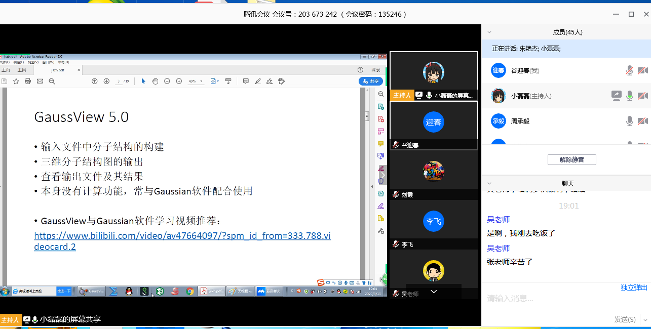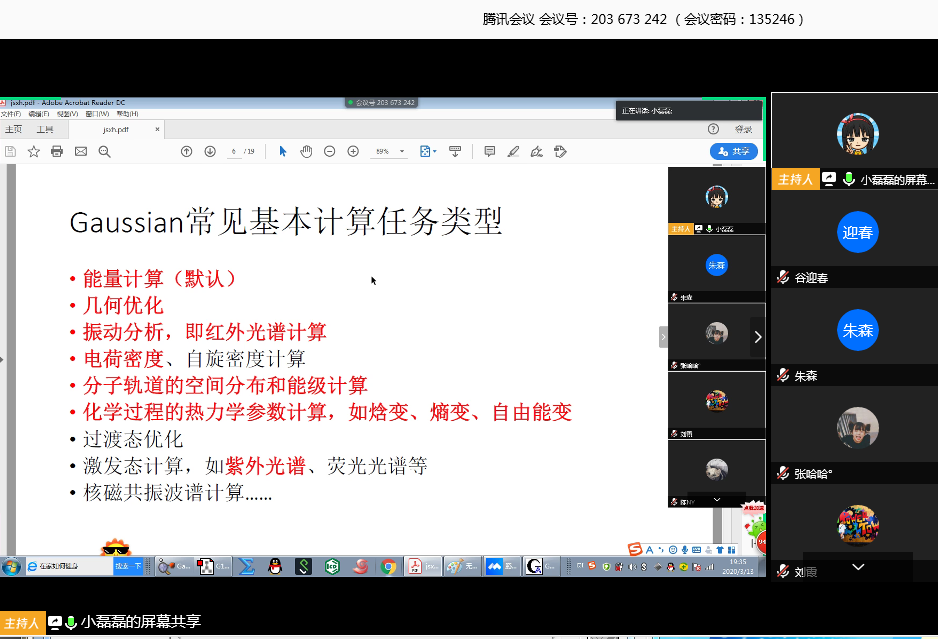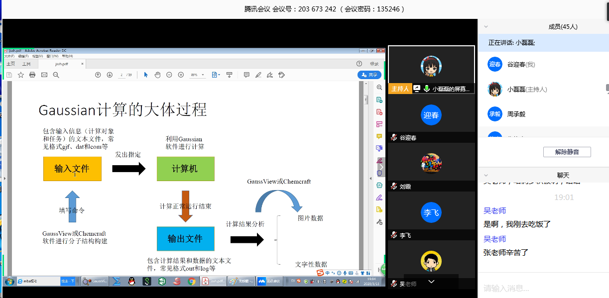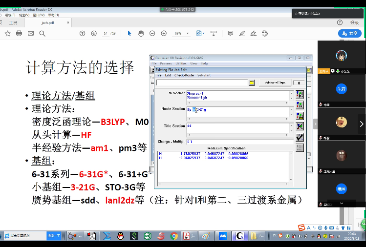 2020年3月13日,为了帮助指导教师和毕业班同学顺利开展毕业论文工作,化学系邀请计算化学方向的张磊老师为应用化学专业师生进行了计算化学专题辅导讲座。讲座采取腾讯会议形式在线进行,应用化学专业的56名师生参加了培训。张磊老师在两个小时的讲座中,以直播的形式生动地讲授了Gaussian等软件的常用功能及使用方法,包括如何优化分子结构、如何计算紫外吸收光谱、如何计算核磁共振光谱以及溶剂效应等。此次计算化学专题讲座,使应用化学专业师生对Gaussian等计算化学软件有了更为深入的了解,为在疫情防控期间顺利完成毕业论文工作奠定了坚实基础。