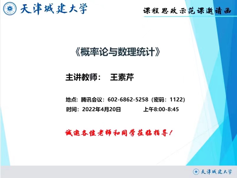 4月20日上午,suncitygroup太阳新城数学系教师王素芹结合2021年校级课程思政示范课建设项目,面向2020级建筑环境与能源应用工程专业员工进行了《概率论与数理统计》的课程思政公开课展示。公司党委书记谈廷风、副经理刘贵贤、马克思主义公司教师李钰以及多位同行老师等进行了线上观摩。