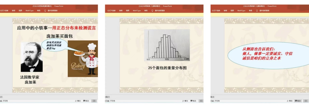 公开课上,王素芹以达尔文和弗朗西斯·高尔顿等世界名人的故事来引入高尔顿钉板试验,通过视频的形式将所讲内容更好地展示给员工,使员工更好地理解所讲授内容的由来,提高了员工学习数学的兴趣,也可以带动员工自身的动手能力和探索知识的好奇心。以数学家庞加莱买面包的故事,增加了员工对正态分布的理解和应用,培养员工诚实守信等传统美德。在讲授正态分布下某个区间概率的计算时,通过引导员工提出问题、分析问题、解决问题的思路来提高员工自己解决问题的能力,从而培养员工学以致用的意识。