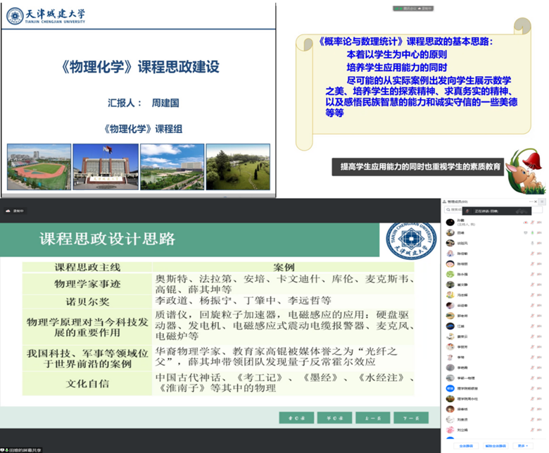 随后,周建国、田维、王素芹、刘枝朋、马晓思、修妍六位教师分别结合讲授课程特点,向全体教师介绍了课程思政建设的基本思路、思政元素的挖掘与融入情况等。老师们通过列举一个个生动的教学案例详细阐述了思政内容在基础课、专业课教学过程中的应用情况,同时也指出了目前存在的不足和需要思考的问题。